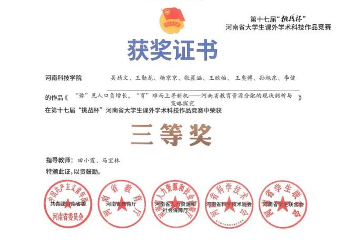 接下来,我院将择优推选团队参与省级竞赛,最终1个团队成功入围省级决赛。此次参赛作品《“豫”见人口负增长,“育”难而上寻新机——河南省教育资源分配的现状剖析与策略探究》由吴婧文、王勤龙、杨京京、张晨涵、王欣怡、王奥博、孙旭东、李健八位同学合作完成,田小霞、马宝林两位老师担任指导。作品聚焦河南省人口负增长背景下的教育资源分配问题,通过现状剖析与策略探究,形成了具有现实意义的研究成果,最终在众多参赛作品中脱颖而出,荣获省级三等奖。