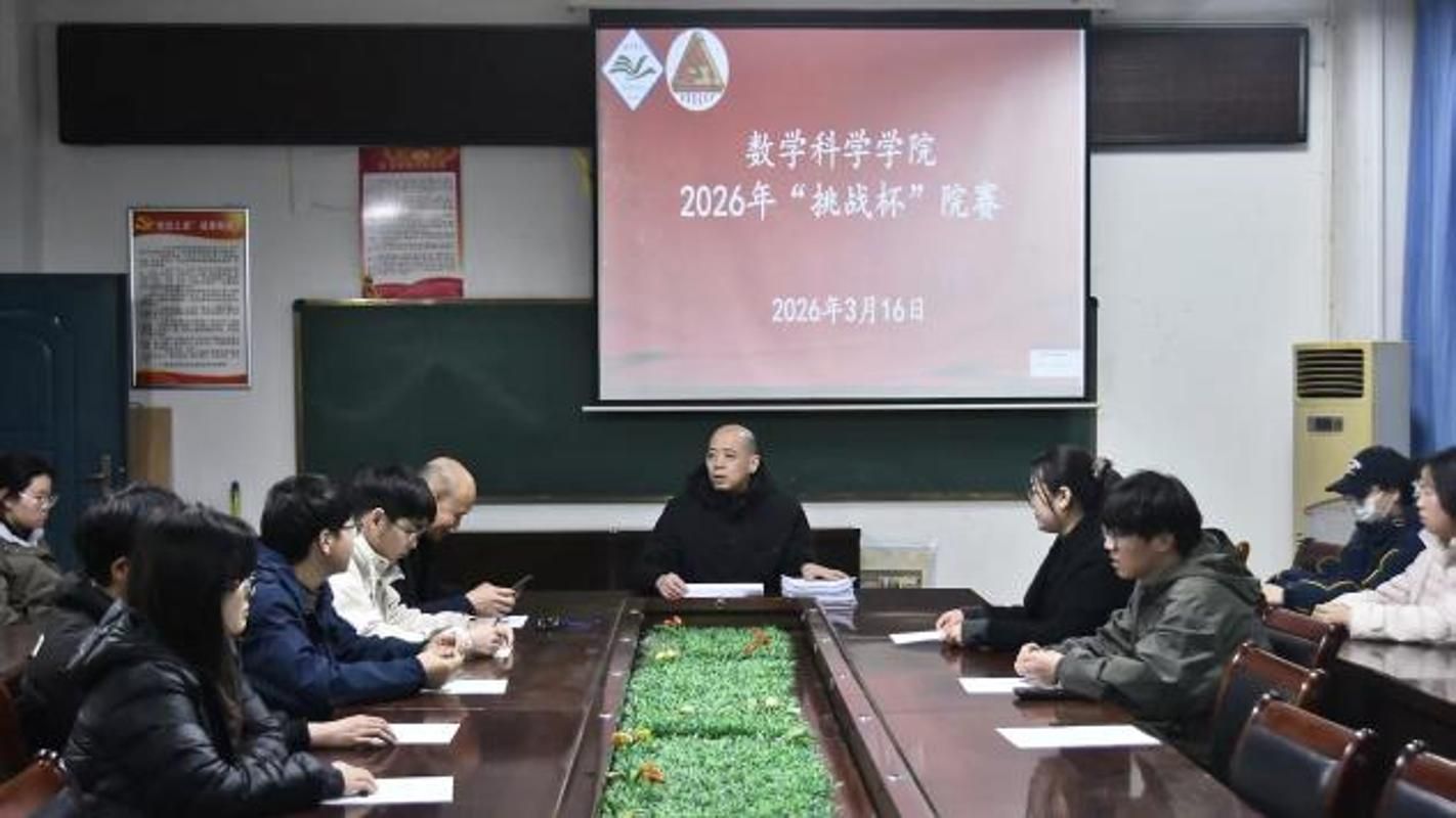 3月15日,数学科学学院在八号楼三楼会议室举办2026年第十八届“挑战杯”竞赛初赛。学院党委副书记马宝林、团委书记曲富柱出席,辅导员田小霞参加,往届获奖代表及研究生代表担任评委。