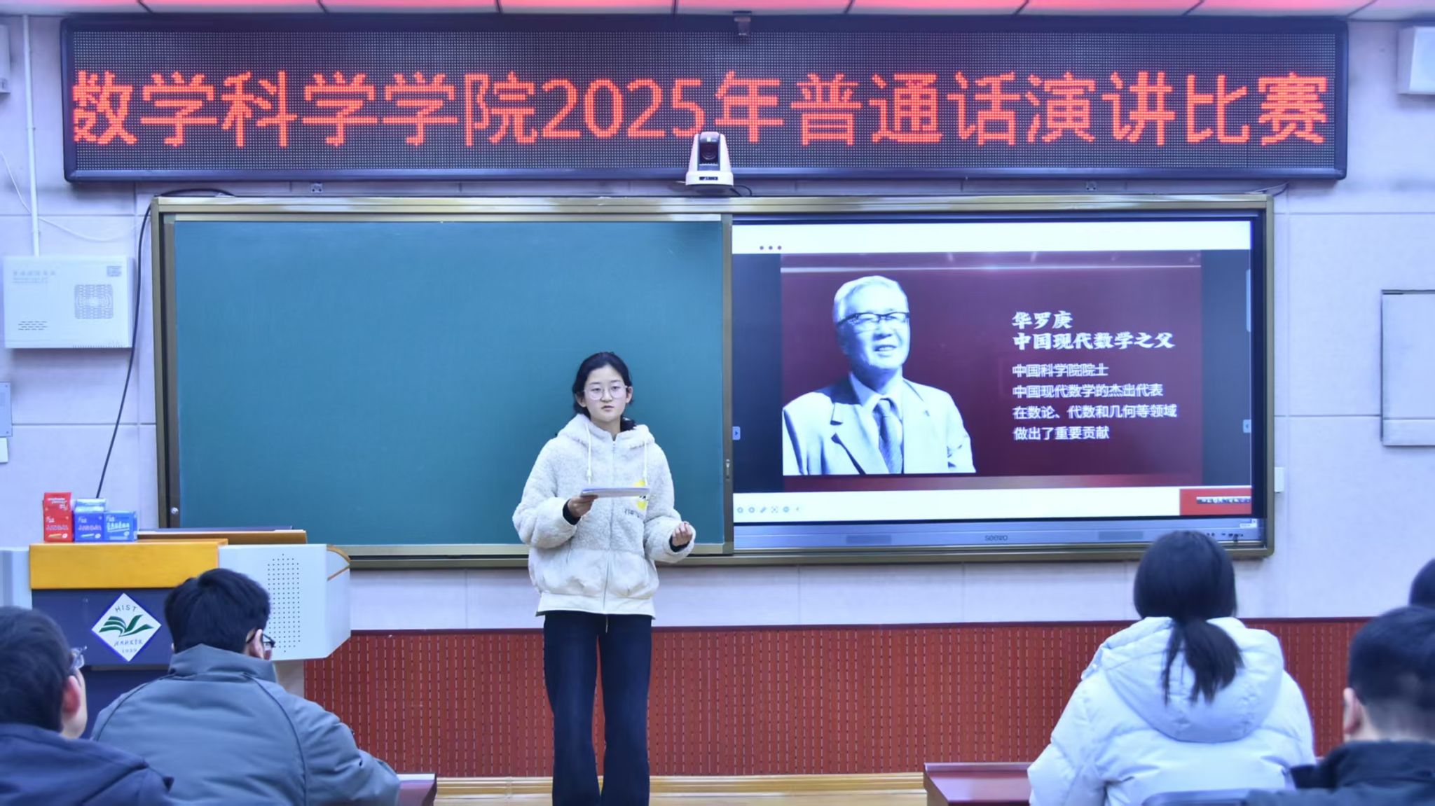 12月11日,恰逢钱学森诞辰114周年之际,数学科学学院在6503教室举办第十一届师范素养月系列活动之“三字一话”活动——“弘扬科学家精神,担当时代重任”演讲比赛决赛。学院团委书记曲富柱,教师姚少魁、王利民,研究生李典、刘硕、田佳毅、杨丽、陈芋见、张雯、曾嘉良、周焕雨、李晓飞和去年获得一等奖的选手李玉舒、闫一帆担任评委,各年级学生代表参与,现场氛围热烈有序。