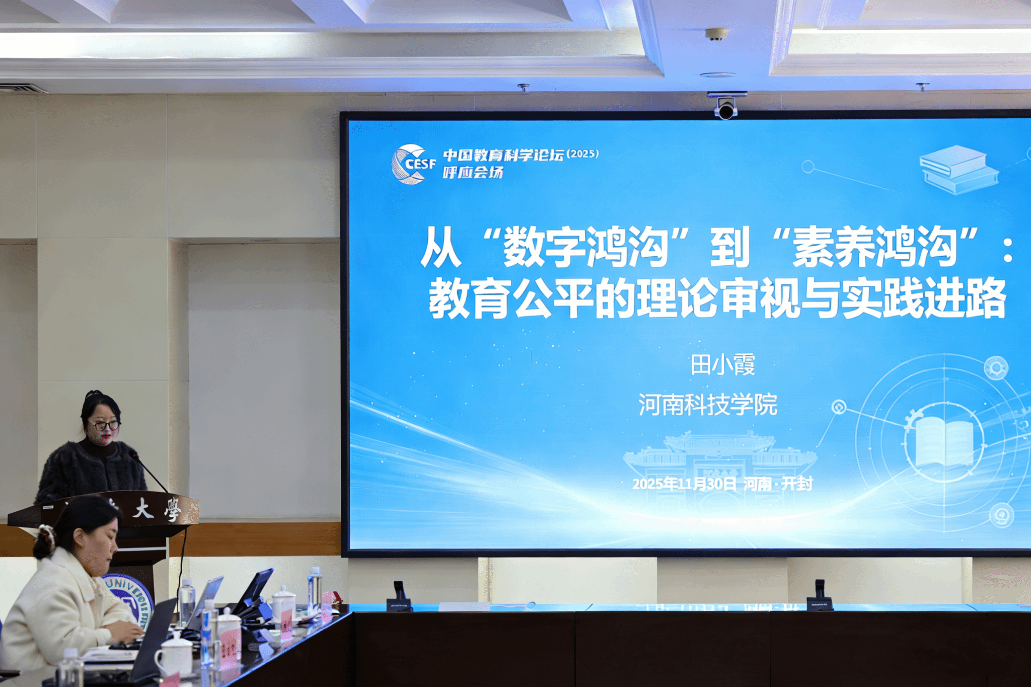 我院教师田小霞受邀参会,并以《从“数字鸿沟”到“素养鸿沟”:教育公平的理论审视与实践转向》为题作报告。分享智能时代下教育公平问题从传统“数字鸿沟”向更深层次“素养鸿沟”的范式转换,剖析了当前教育实践面临的多重困境,并围绕评价体系、资源分配、教师发展及技术融入路径等方面,提出了具有现实意义的实践转向思路。